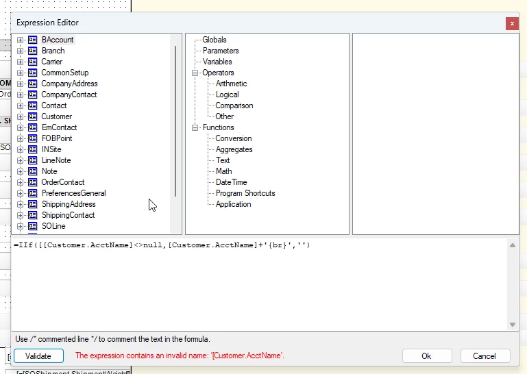 When I started to add in Customer.AcctName into the Expression Editor, upon validation I got the following error message: