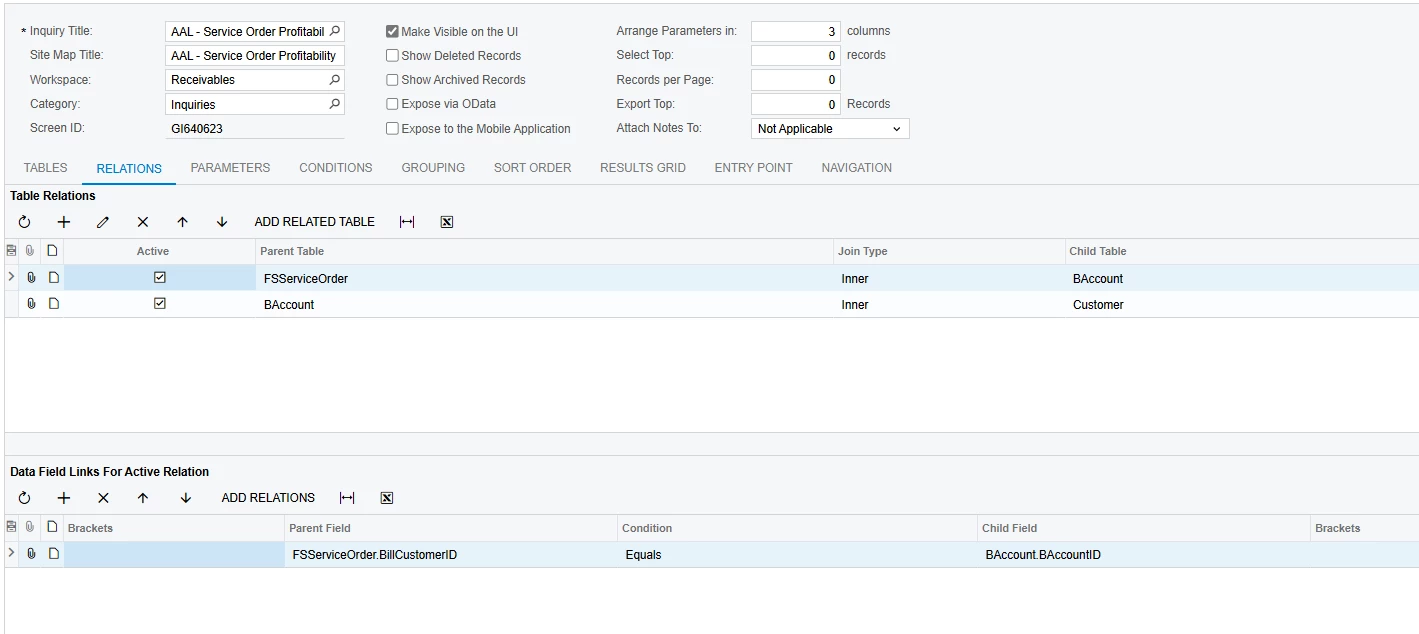 I am creating a Service Order Profitability report that allows the user to enter the billing customer ( We used parent/child so I want to be able to pull based on the parent which is the billing customer) and a date range and it shows description, Invoiced amount and Cost amount.
