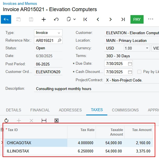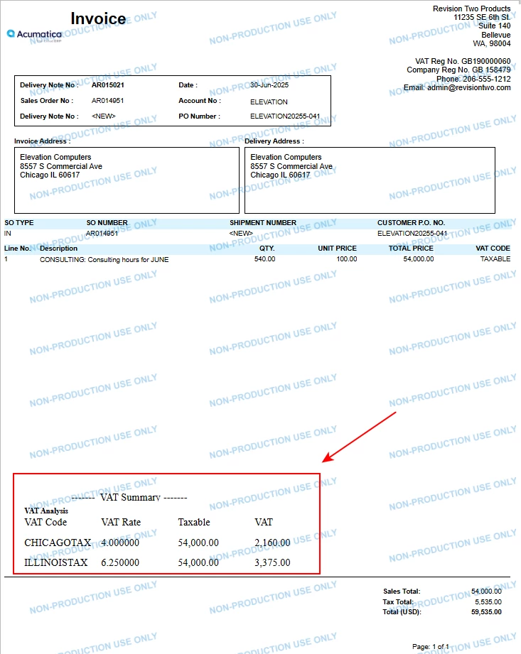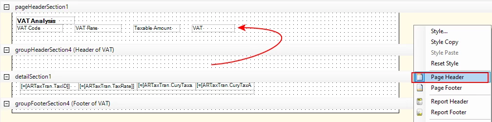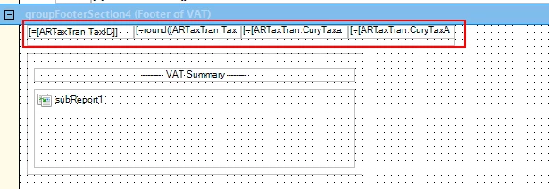 My company often provide services which are charged at different rates of tax. Therefore, we want to show how much in total is charged at each rate. Essentially all I am trying to do is list all the different VAT information which when in Acumatica is shown on the Tax Tab in the invoice screen (screenshot added). I want it to display once on the invoice above the total due information.