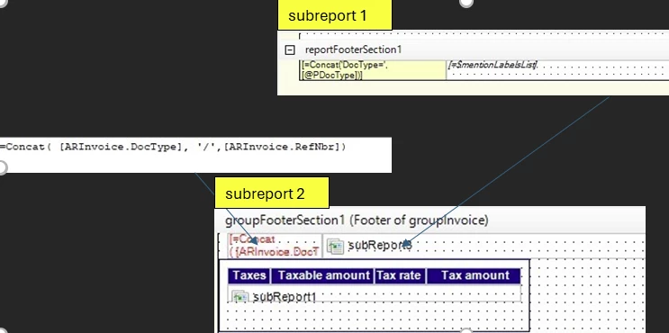 Then, I've modified a second report, say report 2, that displays ARInvoice's informations. The modifications that have been done consists in adding the report 1 as subreport inside report 2.