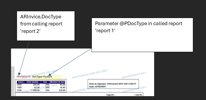 A workaround could be found : the DocType is also avaialble in the parameters of the calling report. If we use this parameter instead of [ARInvoice.DocType], the value is properly provided to the subreport.
