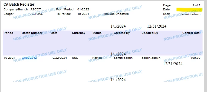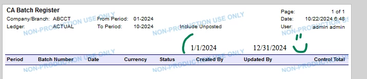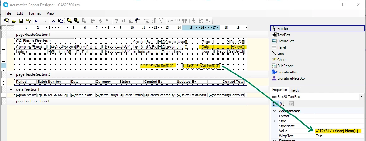 I performed additional tests for you, to hide and then to remove the printed Now() date in the corner of this Acumatica report. My test report still prints year beginning and year end dates,
