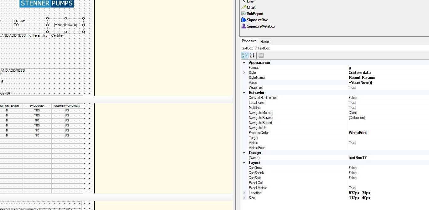 We are designing a new form where by we need to have a FROM: and a TO: using the first of the current year and the last of current year for the period. We would like to use @YearStart, and @YearEnd but are not quite sure where and how to code it in the Report Designer, or if parameters need to be stated first in the Schema. Most, if not all, of our reports have a date already associated with the type of report needed, but in this case, none of that is present. The initial form will be a “blanket” form just to get started. My code in the groupHeaderSection1: I have one text box: [=’FROM:’ + [@DateFrom]], another text box: [=’TO:’ + [@DateTo]]. but these are not showing up on the report in preview at all. My Parameter Schema has DateFrom as Name, Data Type Date Time, Prompt: Start Date, Default Value @YearStart, Visible, Required, and the DateTo has its’ appropriate parameters set up also basically the same way.
