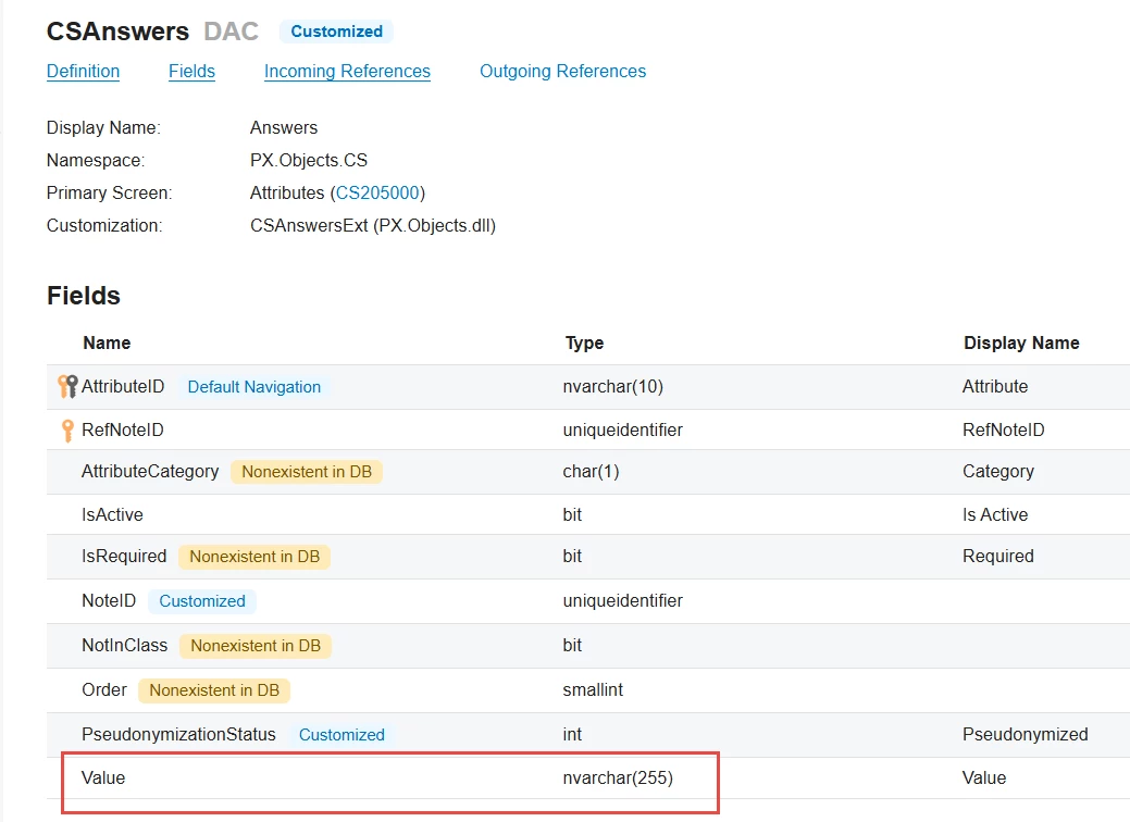 However, in DAC PX.Objects.CS.CSAnswers Attribute Value is stored as VARCHAR.