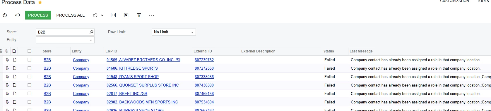 The first sync is fine and acts as expected. If we change information on the contact or location permissions the data transfers to shopify but the ACM sync log gives the error ‘Company contact has already been assigned a role in that company location.’