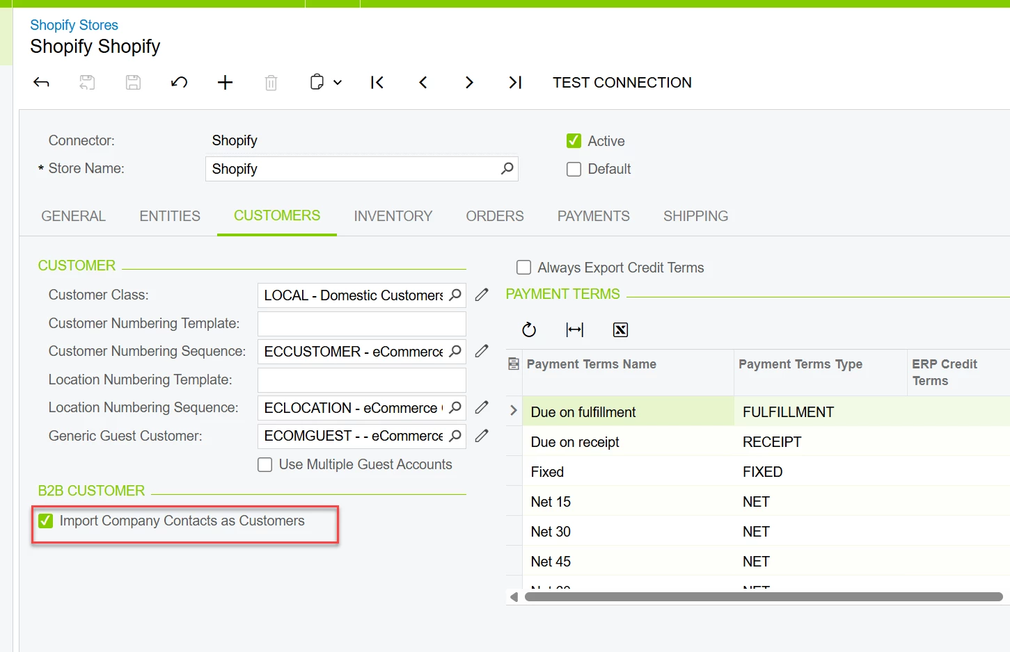 We are encountering an issue with the Shopify connector for Acumatica24R1 regarding the synchronization of Business Customers (B2B). Both Company and Customer entities are active and both in bi-direction.