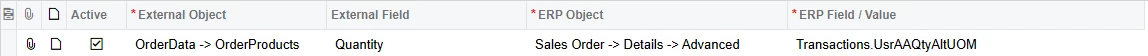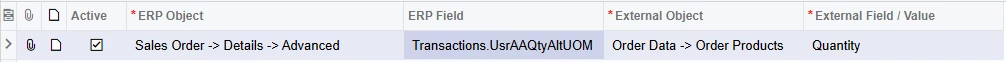 Now, I know I’m getting off the expected path here because I had to type in the Objects and Fields manually without spaces instead of being able to select from a drop down. Surprisingly, it works - well - half works. The system recognizes OrderData.OrderProducts.Quantity just fine and I can map to it normally (ex ‘Sales Order -> Details -> Open Qty’). However, my issue/lack of knowledge is around the “-> Advanced” part and Transactions view of the Sales Order.