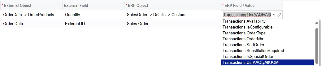 I’m running into an unusual asymmetry between how the import and export entity mappings are for Sales Orders. We have an Acumatica line-level custom field - AltQuantity for short - which we want to link to the BigCommerce Quantity value of each respective item on a sales order. The Import mapping works as expected, even though the custom field isn’t available from the drop down in the ERP Field column.