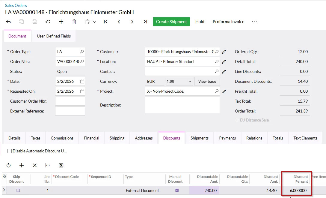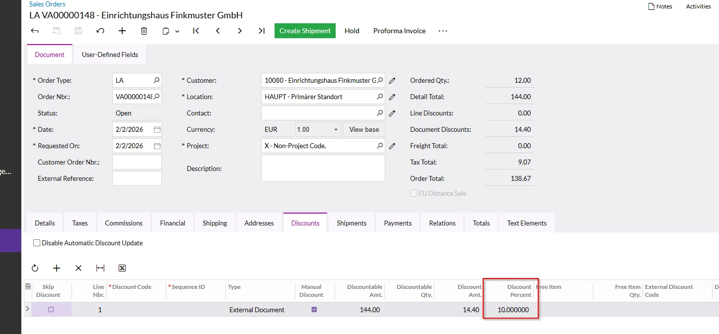 The problem is manual discounts -> if you change the percentage, it is linked to the amount and not to the discount rate -> if you add or remove items with manual discounts in Sales Orders, the discount rate also changes, even though it should remain the same: The discount rate should be fixed and not flexible and dependent on the amount.