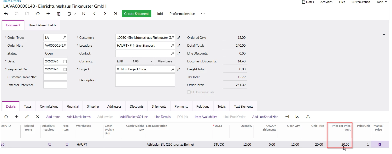 SO and the product costs are 12,00 per unit. I add an manual Discount of 10%: