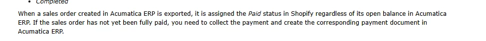With the B2B features of Shopify, an order may be placed for a customer having terms like 30 days. The Payment entity only supports importing from Shopify. If the order is paid in Acumatica how can that information be sent back to Shopify?