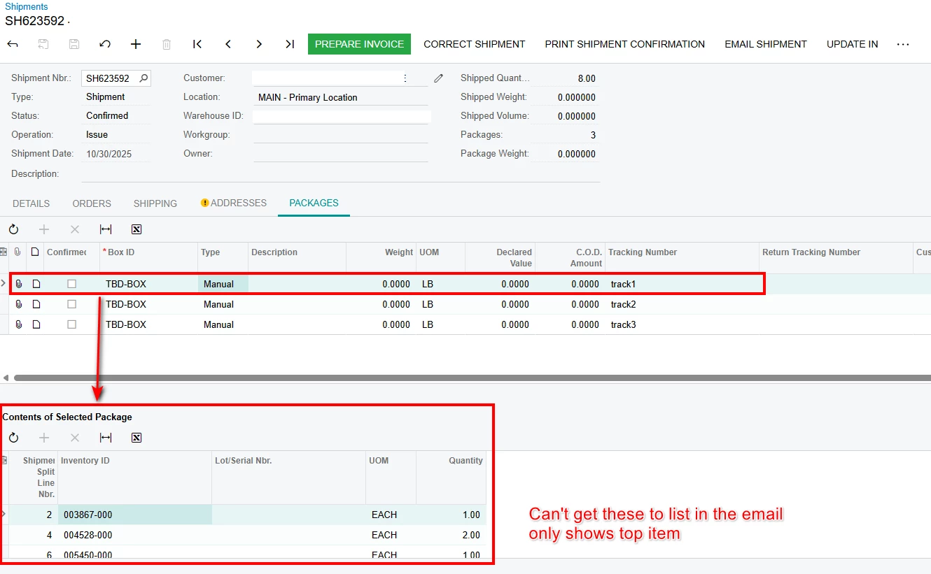 Goal: To send an email out once a shipment is confirmed to the customer. The email should have a list of packages, each package with its tracking number. I also want to show what item(s) are in each package