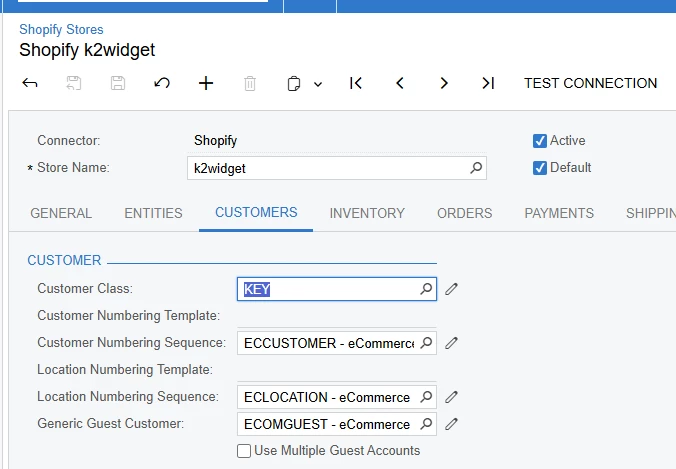 In the commerce connector how can I import shopify orders but have them all use the default guest checkout customer nbr?
