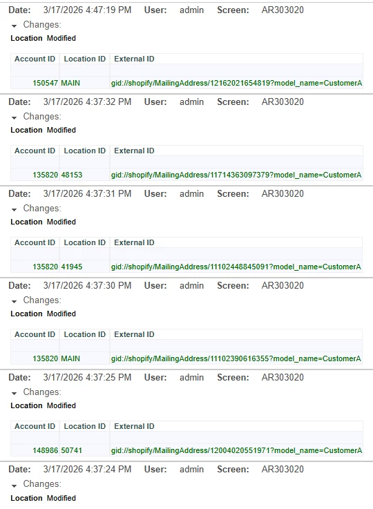 In addition I found today that when I look at audit history for any customer, it will show me a bunch of location changes for different customers, different random locations. I don't know what these mean and why they're showing up on another customer that's not even connected to our Shopify store.