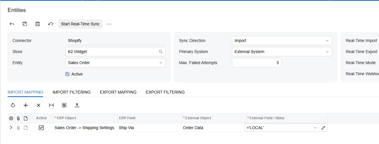 I suppose that you had that custom mapping in Entities screen at the time when this new order came? If so, then I would raise a ticket with Acumatica. But, if it wasn’t, then I would try to create a new Shopify order with a new shipping method, and see if your custom mapping doesn’t pick it up for you.